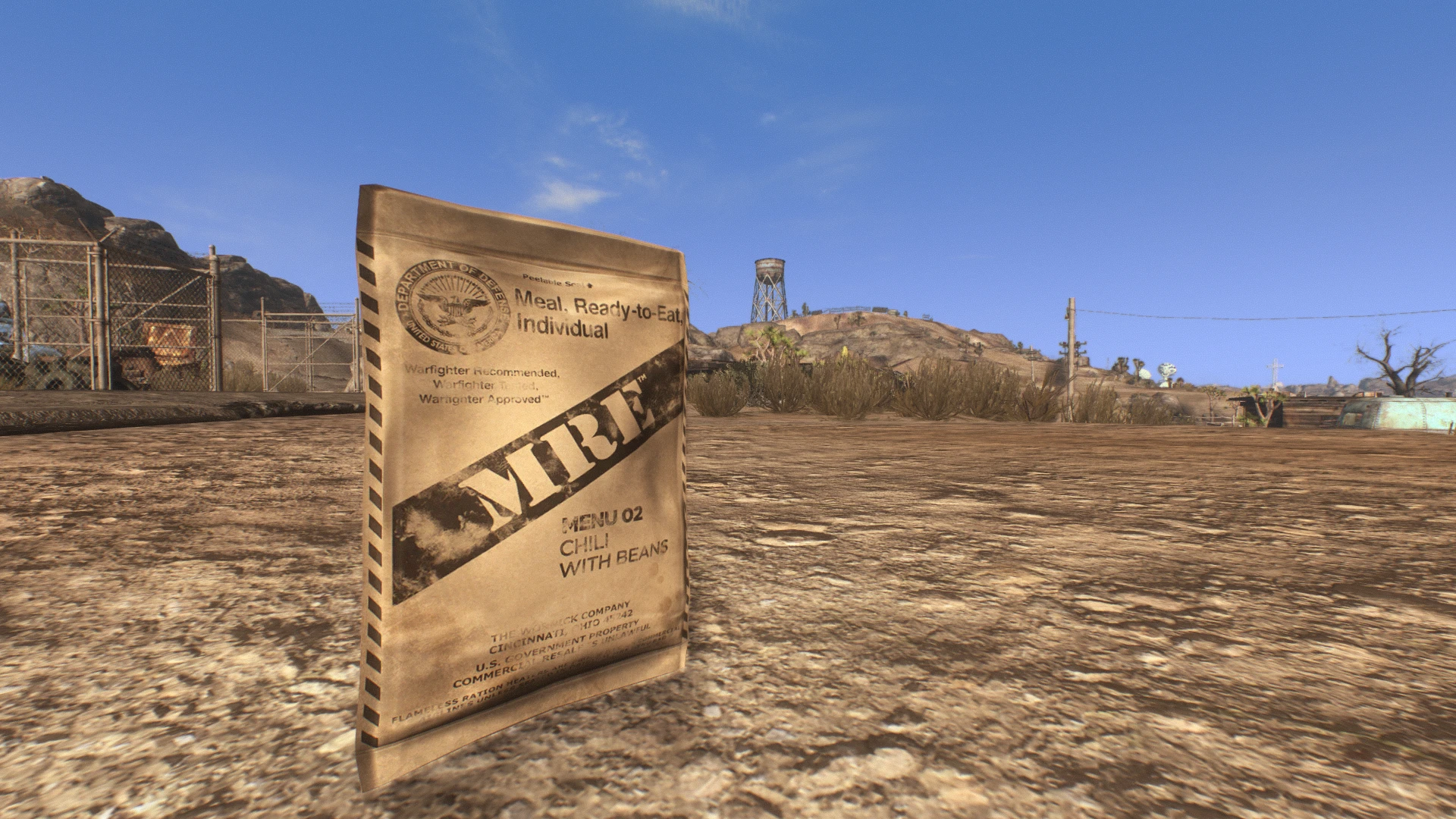 Base Object Swapper (Requires BOS - Community Master Plugin): This one gives the MREs 14 different textures (Flavors), due to the nature of BOS a plugin is necessary, I also made a simple script which will convert all MREs on pick up into the original one to make this mod completely compatible with any rebalance/overhaul mods that you might be using.