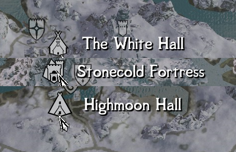 Adds map markers to the Stonecold Fortress, The White Hall, and Highmoon Hall. Stonecold Fortress uses the "City" marker by default and the Highmoon and Whitehall use "Falkreath Castle" map marker. COTN Falkreath already has a map marker for it's Jarl's Longhouse, so no addon is needed. They will use their custom map markers if you use CoMAP. (ESL Flagged)